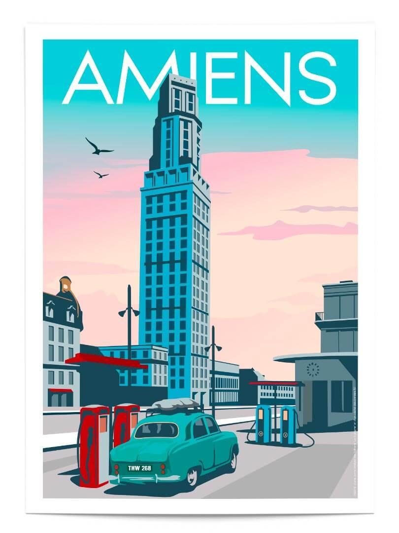 Affiche inspirée d'une carte postale éditée par La Cigogne Reims dans les années 1960 d'après un cliché de la ville d'Amiens en 1950.